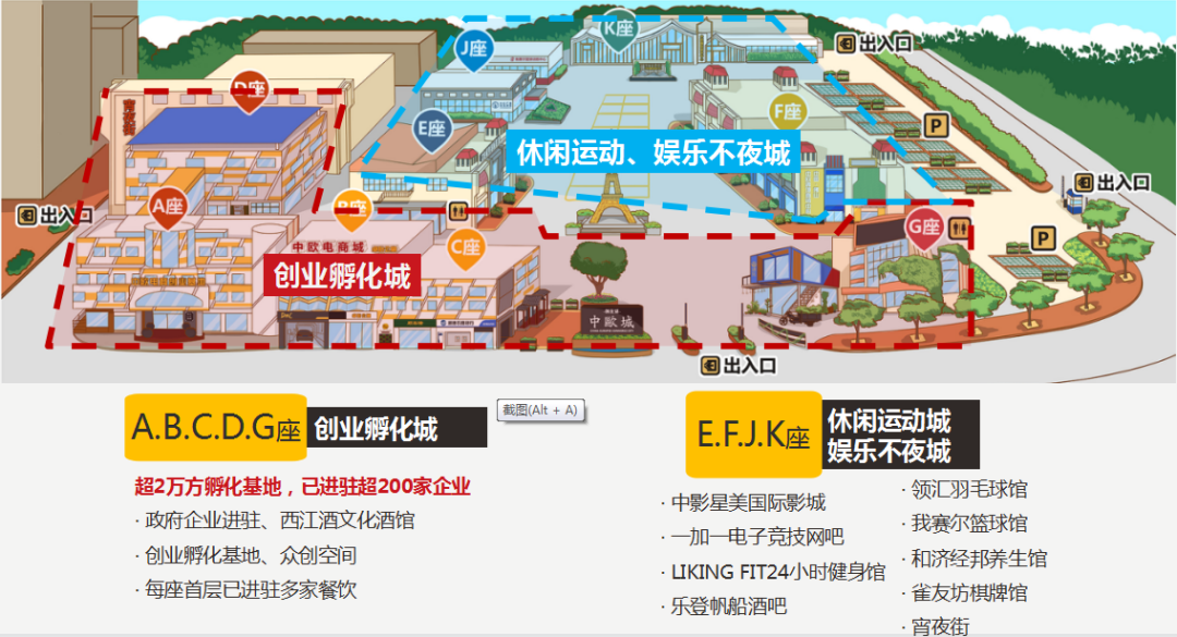 中欧电商城分为两大服务业态,分别为创业孵化基地与休闲、运动、娱乐不夜城。
